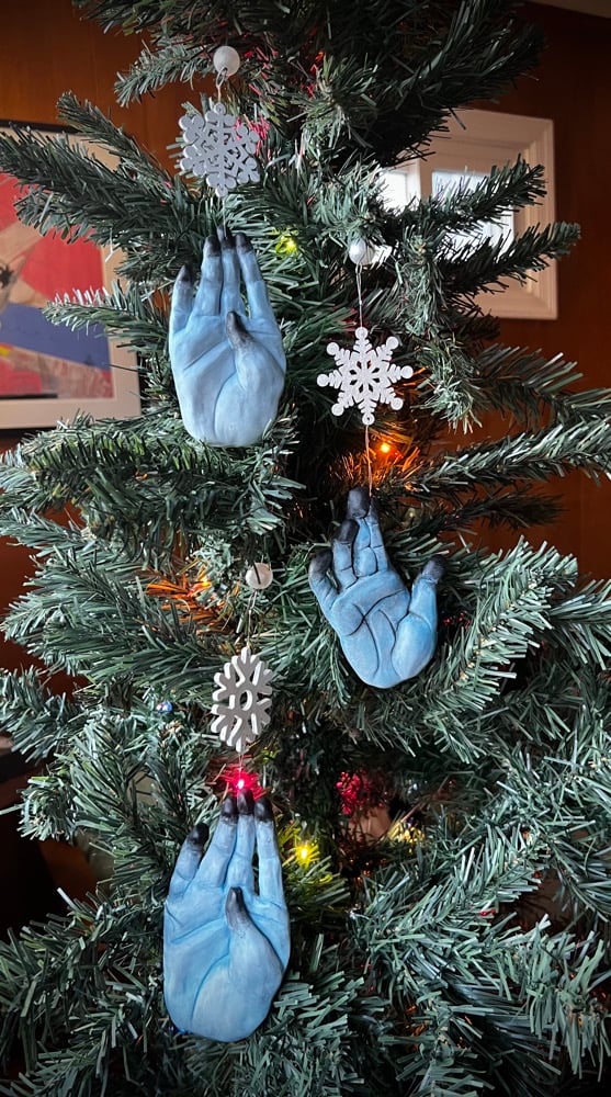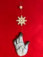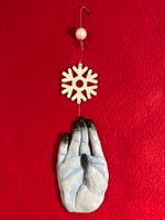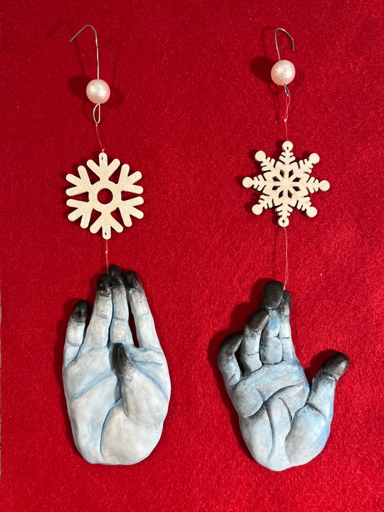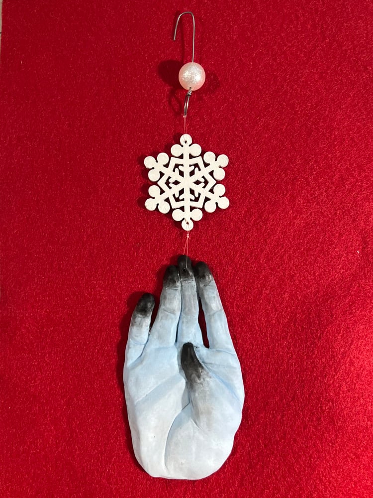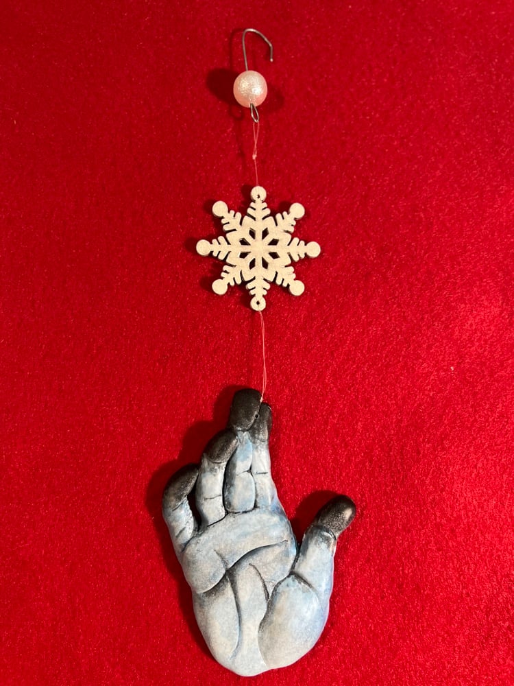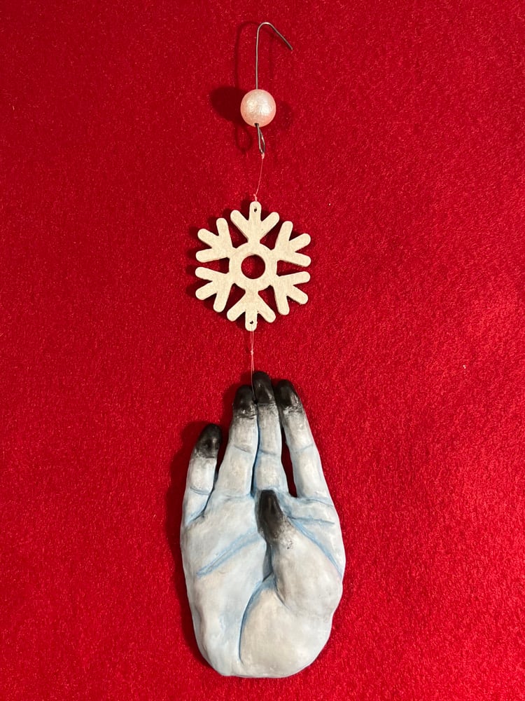 ❄️FRØSTBITTEN❄️ Hand painted resin hand with wooden snowflake ornaments